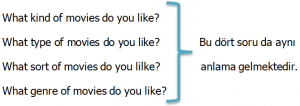 Bu soruları sorarken “What kind of” tan sonra “movies” getiriyoruz. Çünkü “Ne tür filmler” diye soruyoruz, yani çoğul isim kullanmamız gerekir.